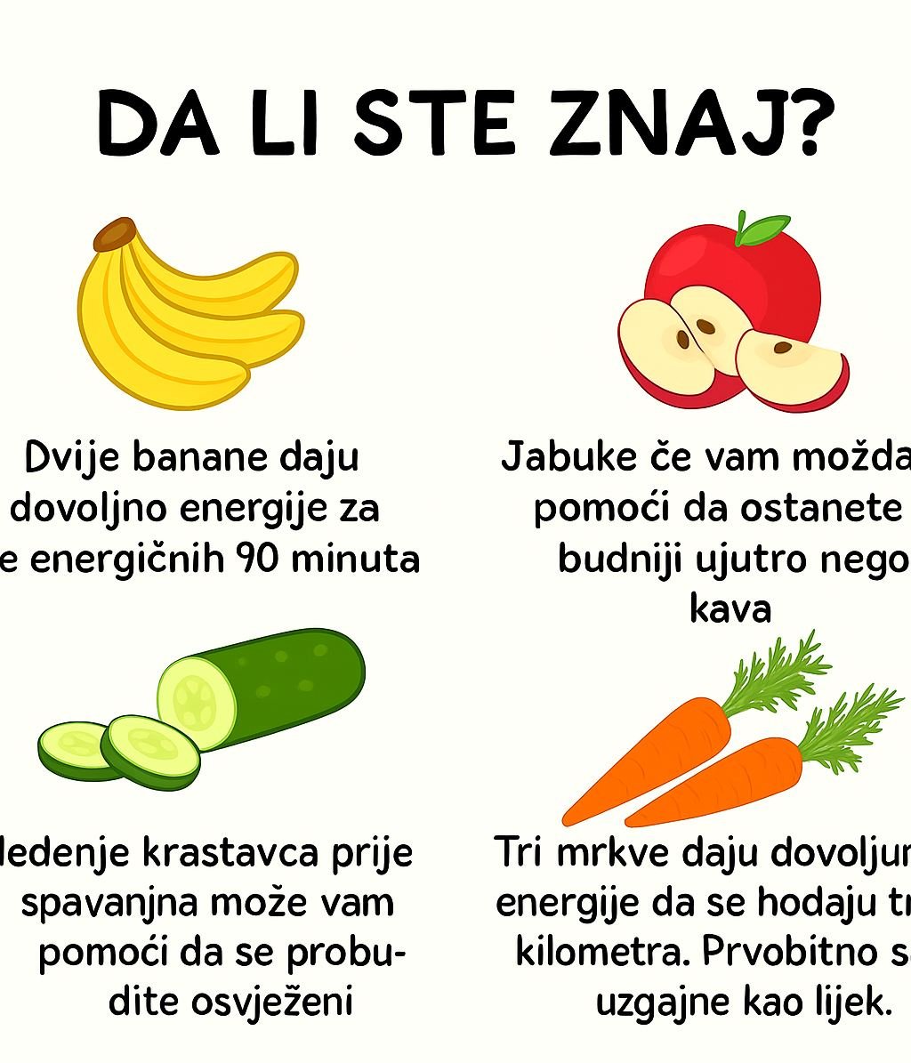 🥕 Mrkve – Tri mrkve daju dovoljno energije da prehodate tri kilometra! Osim što su odlične za vid, mrkve su se nekad uzgajale kao ljekovita biljka zbog bogatstva beta-karotena i antioksidanata.