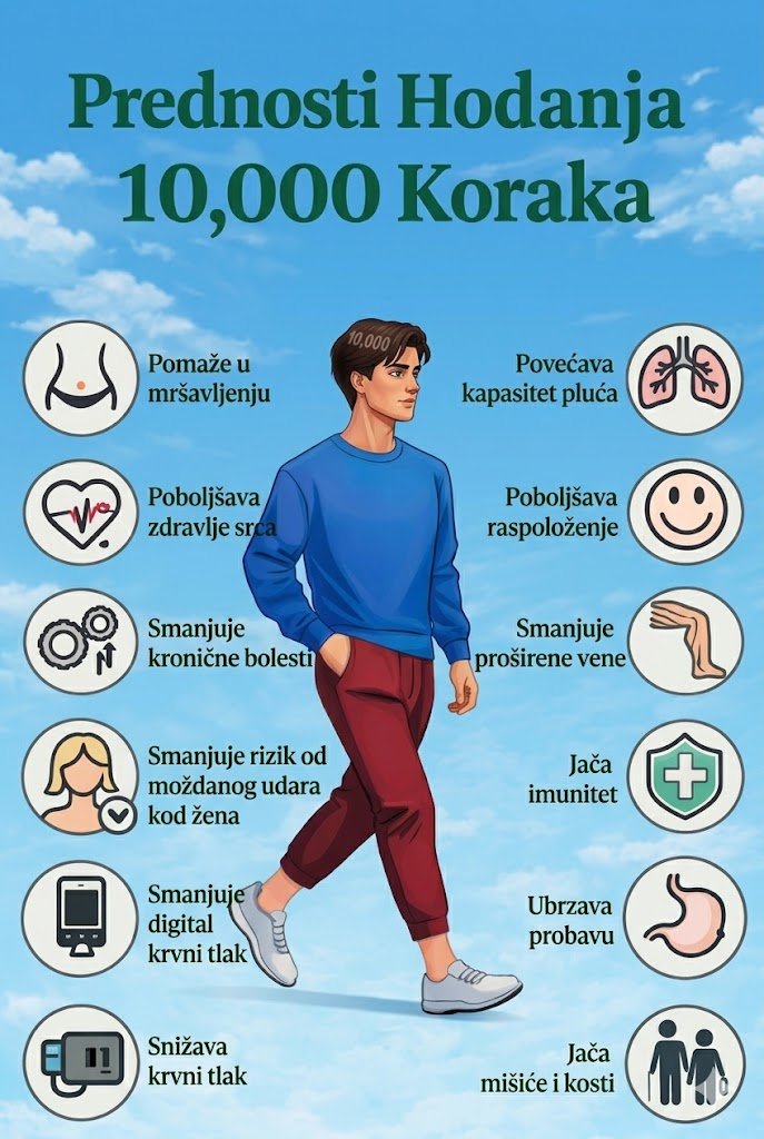 Hodanje od 10.000 koraka dnevno je jednostavna navika s prednostima koje mijenjaju život. Bez obzira da li je vaš cilj bolja kondicija, poboljšano raspoloženje ili dugoročno zdravlje, ova svakodnevna aktivnost može napraviti veliku razliku. Ostanite dosljedni, ostanite aktivni i uživajte u putovanju ka zdravijem životu.