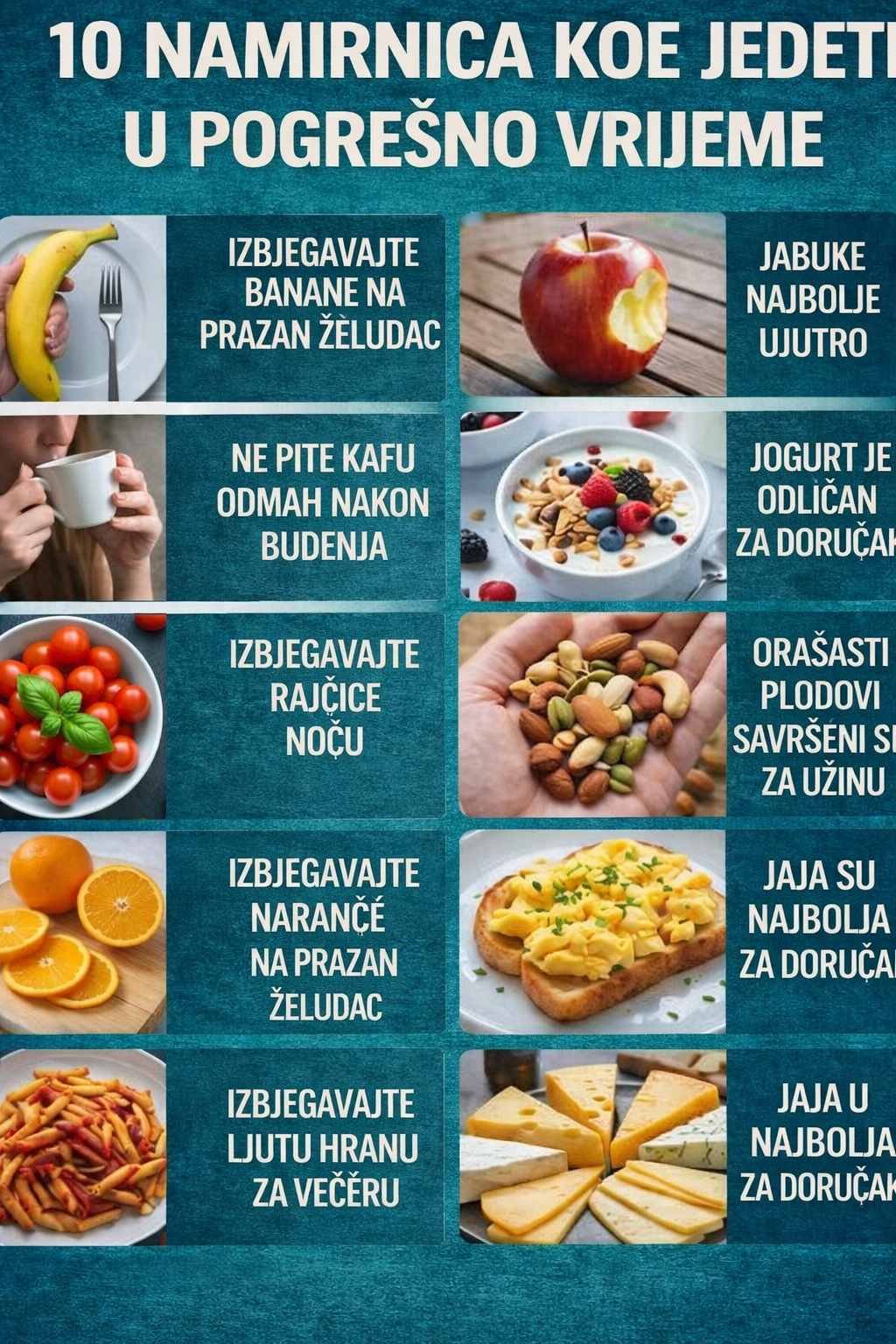 Vrijeme kada jedemo određene namirnice jednako je važno kao i sam izbor hrane. Neke namirnice mogu imati pozitivan efekat na organizam ako se konzumiraju u pravo doba dana, dok u pogrešno vrijeme mogu izazvati nelagodu, umor ili probavne smetnje. U nastavku donosimo primjere najčešćih grešaka.