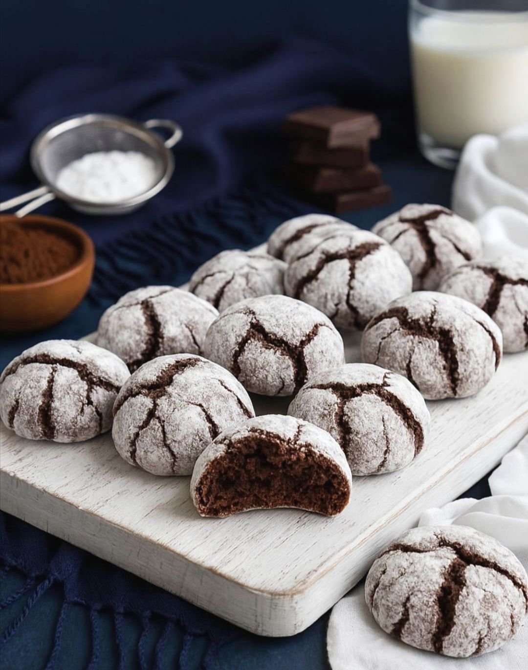 Potrebni sastojci: 200g istopljene čokolade, 80g istopljenog putera, 100g šećera, 2 jaja, 200g brašna, 1 kašikica praška za pecivo i 1kašika kakao praha. Dodatno treba još 5 kašika kristal šećera i 5 kašika šećera u prahu. POSTUPAK PRIPREME: