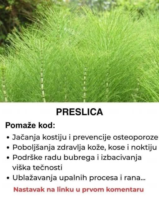 Preslica (lat. Equisetum arvense), poznata i kao horsetail ili paukovac, je biljka s dugu tradiciju upotrebe u narodnoj medicini. Zahvaljujući bogatom sastavu minerala, posebno silicijuma, preslica se danas smatra vrijednim prirodnim sredstvom za održavanje zdravlja kostiju, kože, kose te za podršku radu bubrega i ublažavanje upala. Kĺjučne oblasti djelovanja ✅ Jačanje kostiju i prevencija osteoporoze Visok sadržaj silicijuma u preslici podržava stvaranje koštane … Read more