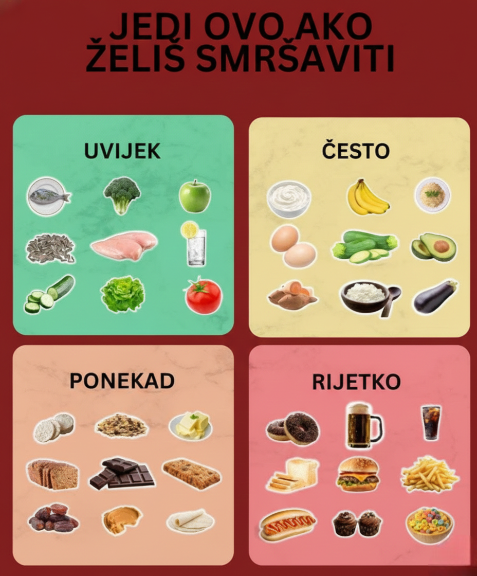 Mršavljenje ne znači gladovanje, već pravilan izbor hrane i kontrolu porcija. Ovaj raspored pomaže da lakše napraviš zdrave odluke. 🟢 UVIJEK (osnova ishrane) Ove namirnice možeš jesti svakodnevno jer su bogate nutrijentima, a siromašne kalorijama: Povrće (brokoli, zelena salata, paradajz, krastavac) Voće s malo šećera (jabuke) Piletina i nemasni proteini Riba Jaja (umjereno) Voda i … Read more