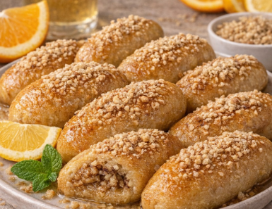 Posne hurmašice sa orasima Sočne, mekane i mirisne na narandžu i limun Sastojci Za testo: 300 g brašna 120 ml ulja 120 ml vode 80 g šećera 1 kesica praška za pecivo korica 1 limuna korica 1 narandže Za fil: 150 g mlevenih oraha Za sirup (agdu): 400 ml vode 300 g šećera sok od ½ limuna kriška limuna ili narandže Priprema 1. TestoU posudi pomešajte ulje, vodu i šećer.Dodajte brašno, prašak za pecivo i koricu limuna i narandže.Zamesite mekano testo. 2. Oblikovanje hurmašicaUzmite mali deo testa, malo spljoštite i u sredinu stavite mlevene orahe.Zatvorite i oblikujte ovalne hurmašice. 3. PečenjePoređajte ih u pleh i pecite u rerni na 180°C oko 25 minuta, dok ne porumene. 4. Sirup (agda)U šerpi kuvajte vodu i šećer oko 10 minuta, pa dodajte sok od limuna. 5. Završni korakVruće hurmašice prelijte toplim sirupom i pospite mlevenim orasima.
