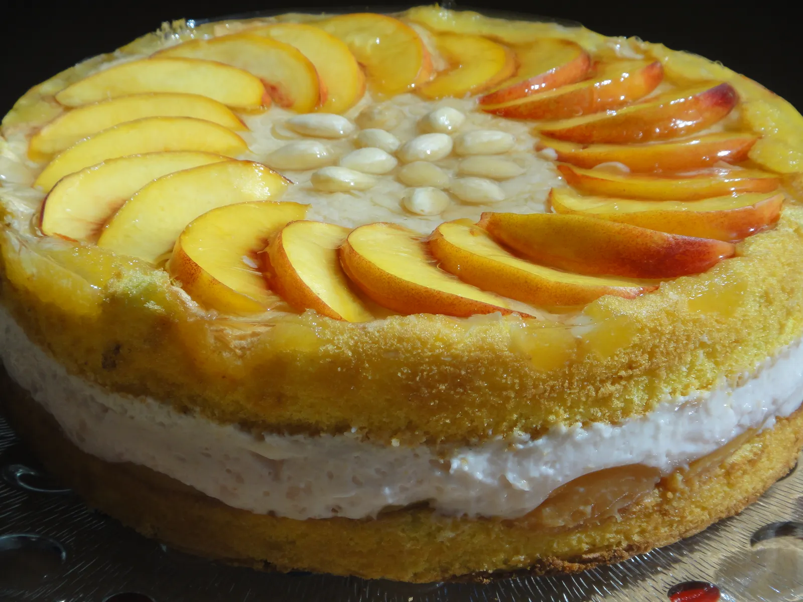 Slaganje torte radi se u kalupu u kojem su se pekle kore ili specijalnom rastezljivom okviru za slaganje u kojem sam ja radila. Ovo drugo je bolje jer se biskvit u pecenju malo smanji pa se rastezljivi kalup ljepse prilagodi. Prvo ide zuti biskvit na koji sam poslagala kuhano voce. Mozete kuhane polutke i usitniti na komadice i ubaciti u kremu. Ja sam ih ovaj put poslagala na biskvit i prekrila kremom. Na kremu ide drugi biskvit. Bijela strana ide gore i dovoljno bi bilo samo posipati secerom u prahu. Ja sam ipak odlucila malo ukrasiti sa vocem. Narezala sam 2 svjeze nektarine, u sredini stavila malo oljustenih badema i zalila sa 1 svijetlim preljevom da se voce fiksira.