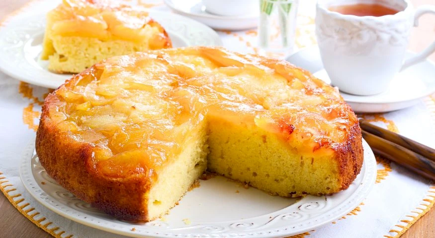 Pecite 35-40 minuta, dok površina ne postane zlatna, a čačkalica umetnuta u sredinu izlazi čista. Ostavite kolač da se malo ohladi, zatim ga preokrenite na tanjur tako da jabuke budu na vrhu.