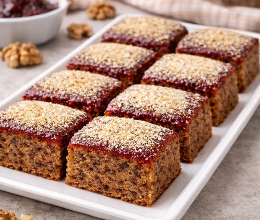 Ovaj jednostavan kolač sa orasima i džemom je mekan, ukusan i idealan za svaki dan. Brzo se pravi, a još brže nestaje sa stola.