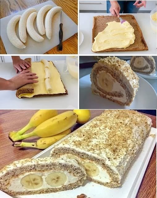 Biskvit premazati džemom od malina, pa preko staviti 2/3 kreme; pažljivo razmazati, pa na jedan kraj staviti dvije banane.