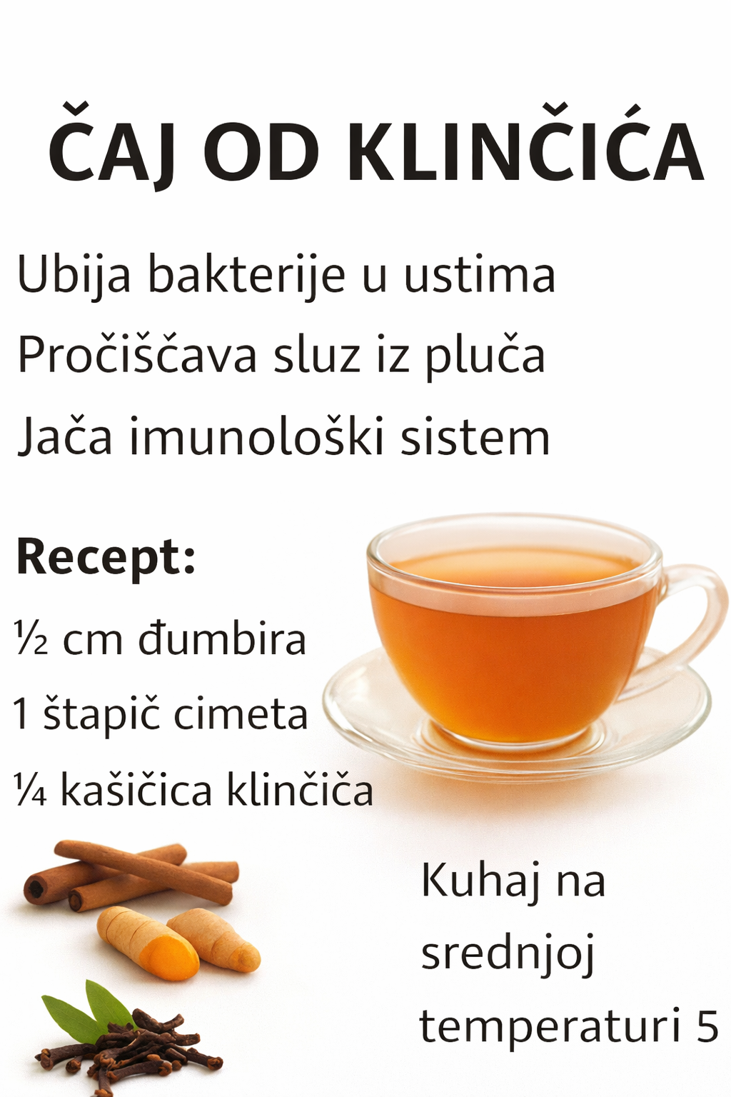 Čaj od klinčića je jednostavan i prirodan način da podržite svoj imunitet i poboljšate zdravlje disajnih puteva. Redovno konzumiranje ovog čaja može pomoći u borbi protiv bakterija i doprinijeti opštem zdravlju organizma.
