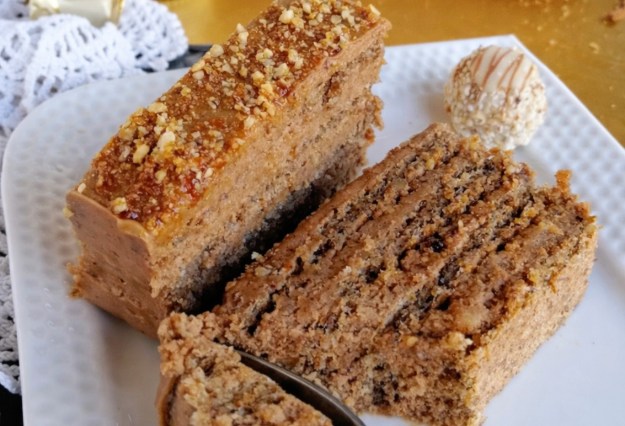 1. Rernu uključite na 200 stepeni. Mutite 6 belanaca dok ne postanu čvrsta na dodir, postepeno dodajte 150 g šećera i mutite još malo. Na kraju umešajte špatulom 150 g mlevenih oraha i kašiku brašna. Veliki pleh od rerne 30 x40 obložite pek papirom, premažite maslacem i pospite brašnom i izručite smesu. Pecite 15 minuta na 200 stepeni. Isto ponoviti još jednom, treba da dobijete 2 kore. Ostavite da se ohladi pa tek onda odvojite od pek papira i presecite uzduž na pola., kako bi dobili 4 kore.