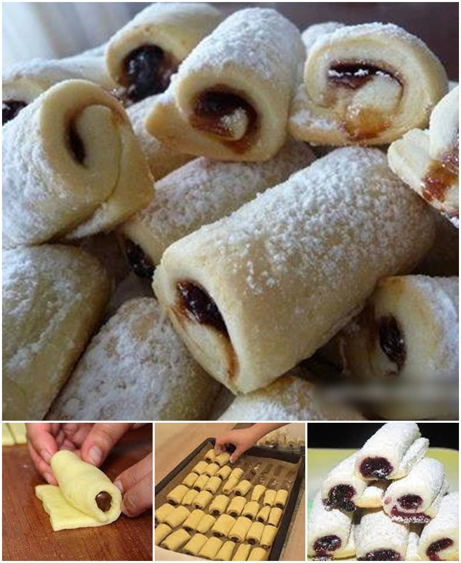 Kad se izvadi iz hladnjaka, ovu količinu podijeliti na dva dijela. Uzeti prvi dio i tanko razvaljati , ali pripaziti da bude više pravokutnik a ne krug. Zatim paralelno na suprotne duže strane mazati pekmez, preklopiti jednom i tanko namazati razmućenim žutanjkom pa preklopiti još nednom i odrezati te malo pomaknuti ili prebaciti sve na jednu stranu. Postupak nastaviti sve dok se ne potroši tijesto. Isto ponoviti i sa drugom polovicom tijesta.