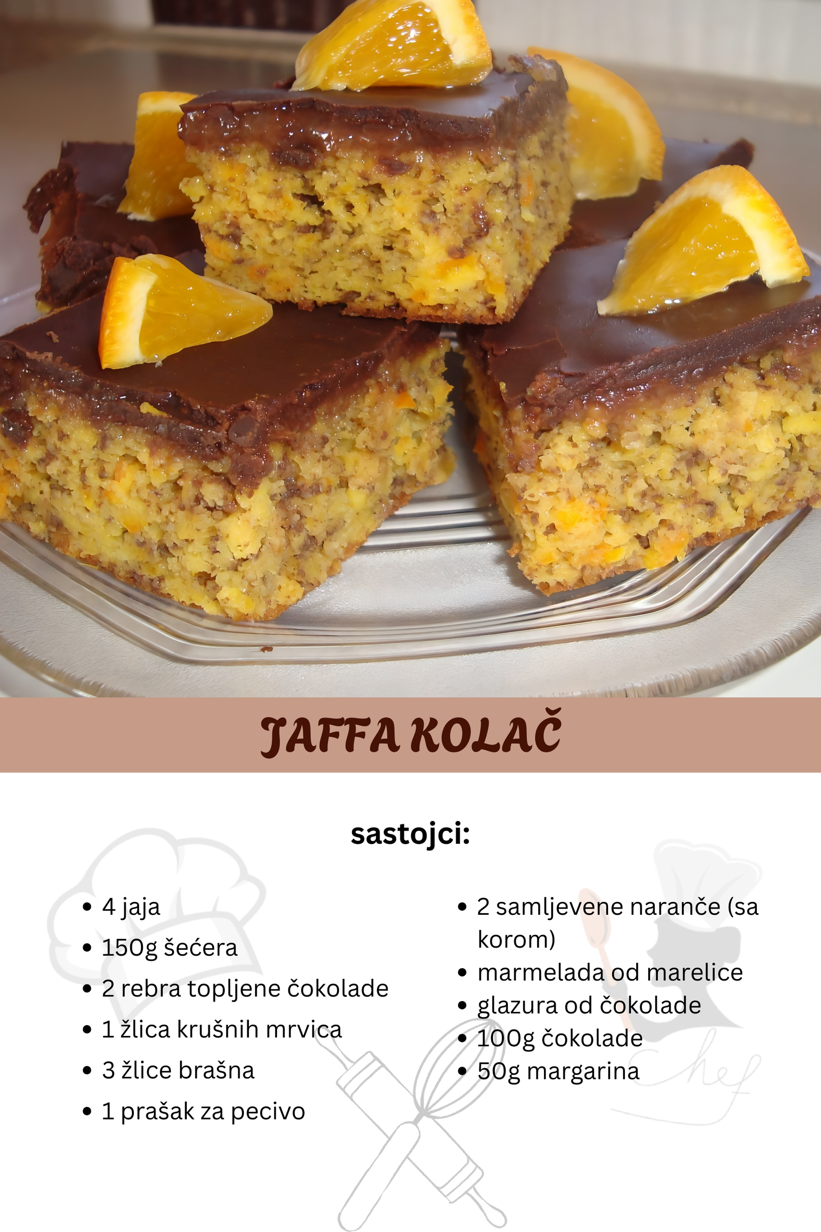 Jaja s šećerom izlupati, dodati rastopljenu čokoladu, samljevene naranče (sa korom!), krušne mrvice, brašno pomješano s praškom za pecivo. Istresti u posudu za pečenje i peći 20 min.