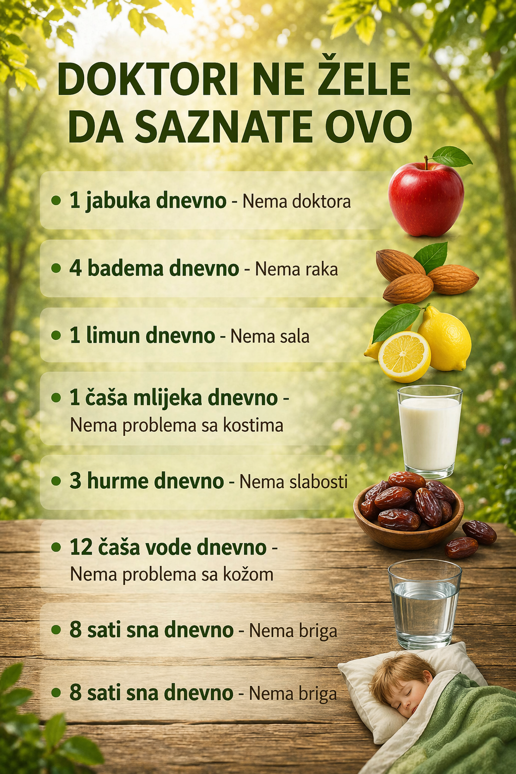 Tvrdnje na slici su pojednostavljene i malo pretjerane. Ove navike podržavaju zdravlje, ali ne garantuju prevenciju ili izlječenje bolesti. Uravnotežena i medicinska njega su i dalje potrebna.