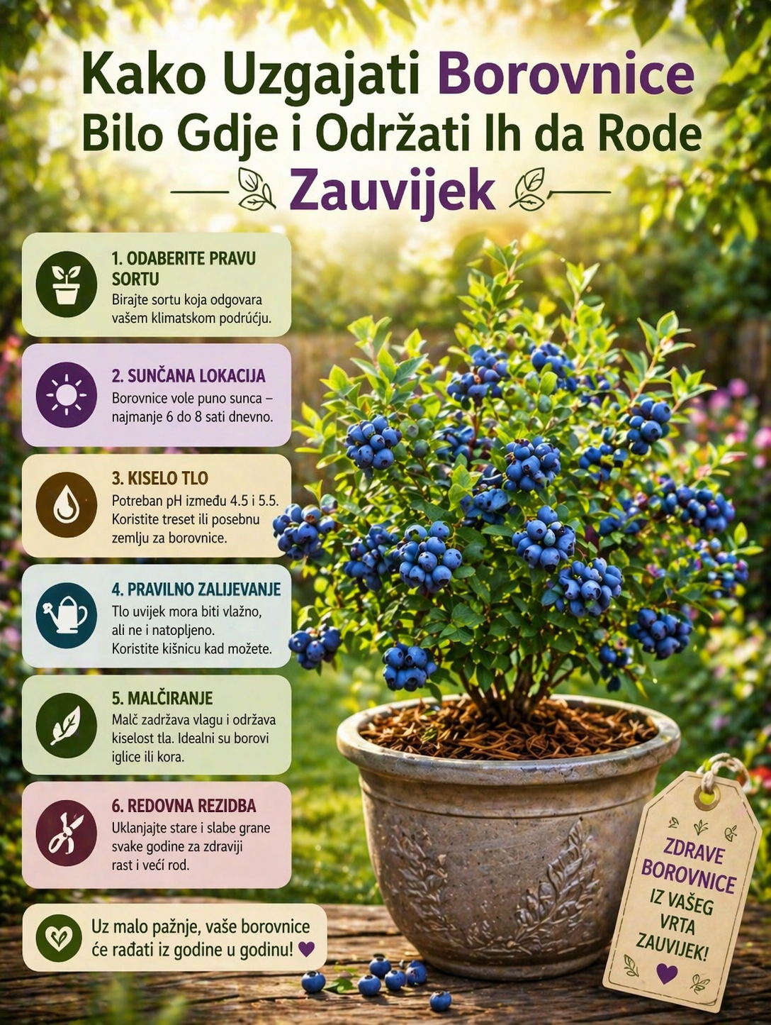 Uz malo pažnje i pravilnu njegu, borovnice mogu davati bogat urod iz godine u godinu. One nisu samo ukusne, već su i izuzetno zdrave, pa su odličan dodatak svakom vrtu ili balkonu.