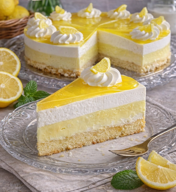 Slaganje ide ovim redom: na ohlađeni biskvit prvo ide vanila krem, zatim limun sloj, pa beli krem. Po vrhu možete preliti želatin za torte ili lagani limun preliv (sok od limuna + malo šećera + želatin). Tortu ostavite u frižideru minimum 3–4 sata, a najbolje preko noći da se svi slojevi lepo stegnu. Rezultat je savršeno osvežavajuća torta sa bogatim, ali laganim kremama koje se tope u ustima.