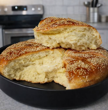 Umutiti žumance sa mlekom, premazati pogaču i posuti susamom.Pečenje