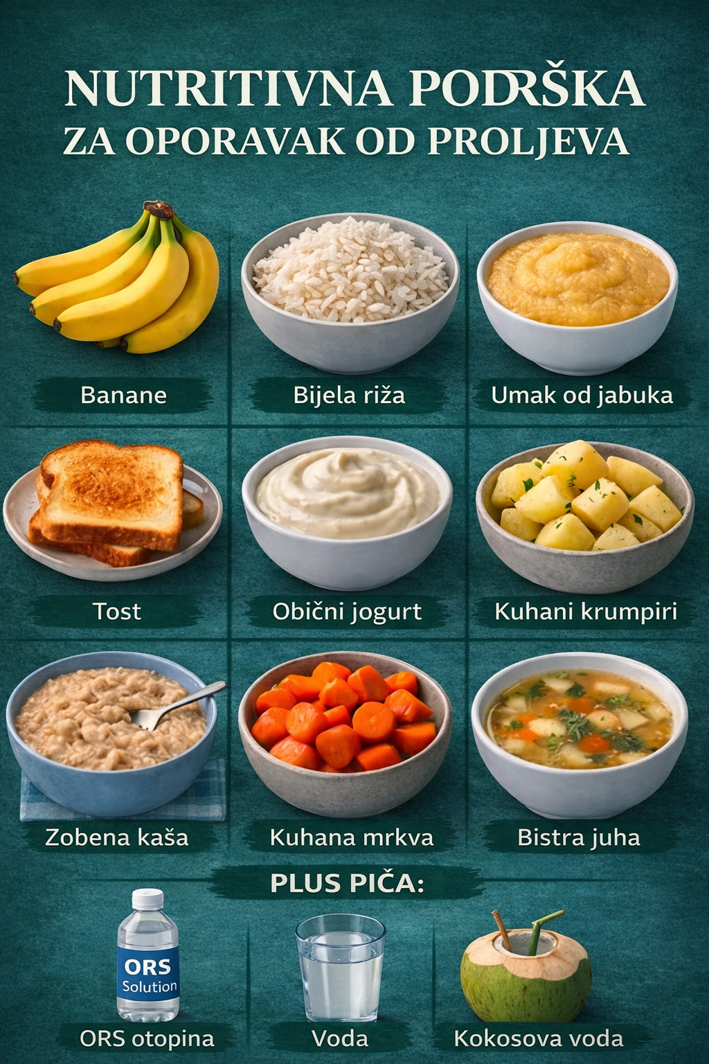 Dobra vijest je da jednostavna, prirodna hrana može pomoći vašem tijelu da se brzo oporavi. Hrana prikazana na slici je blaga za želudac, lako se probavlja i vrlo je učinkovita u vraćanju ravnoteže vašem probavnom sistemu.
