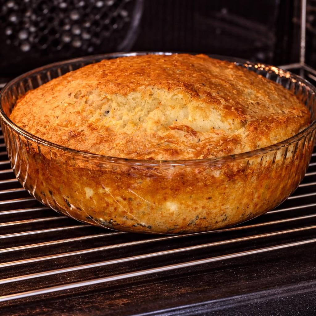 U nauljeni kalup prečnika 22 cm sipajte smesu. Pecite u zagrejanoj rerni na 180°C oko 40 minuta.