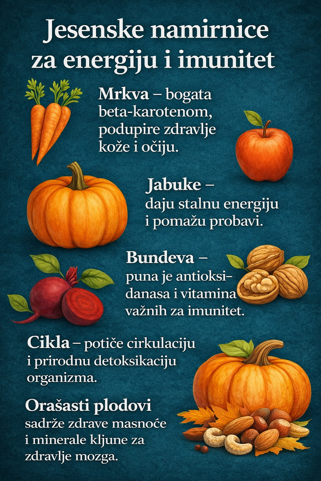 S dolaskom jeseni prehranu treba prilagoditi godišnjem dobu kako bismo očuvali zdravlje i održali imunitet na visokoj razini. Jesensko povrće nije samo ukusno, već je i prepuno hranjivih tvari korisni za zdravlje i za održavanje imuniteta jakim prije nego što temperature postanu niske.