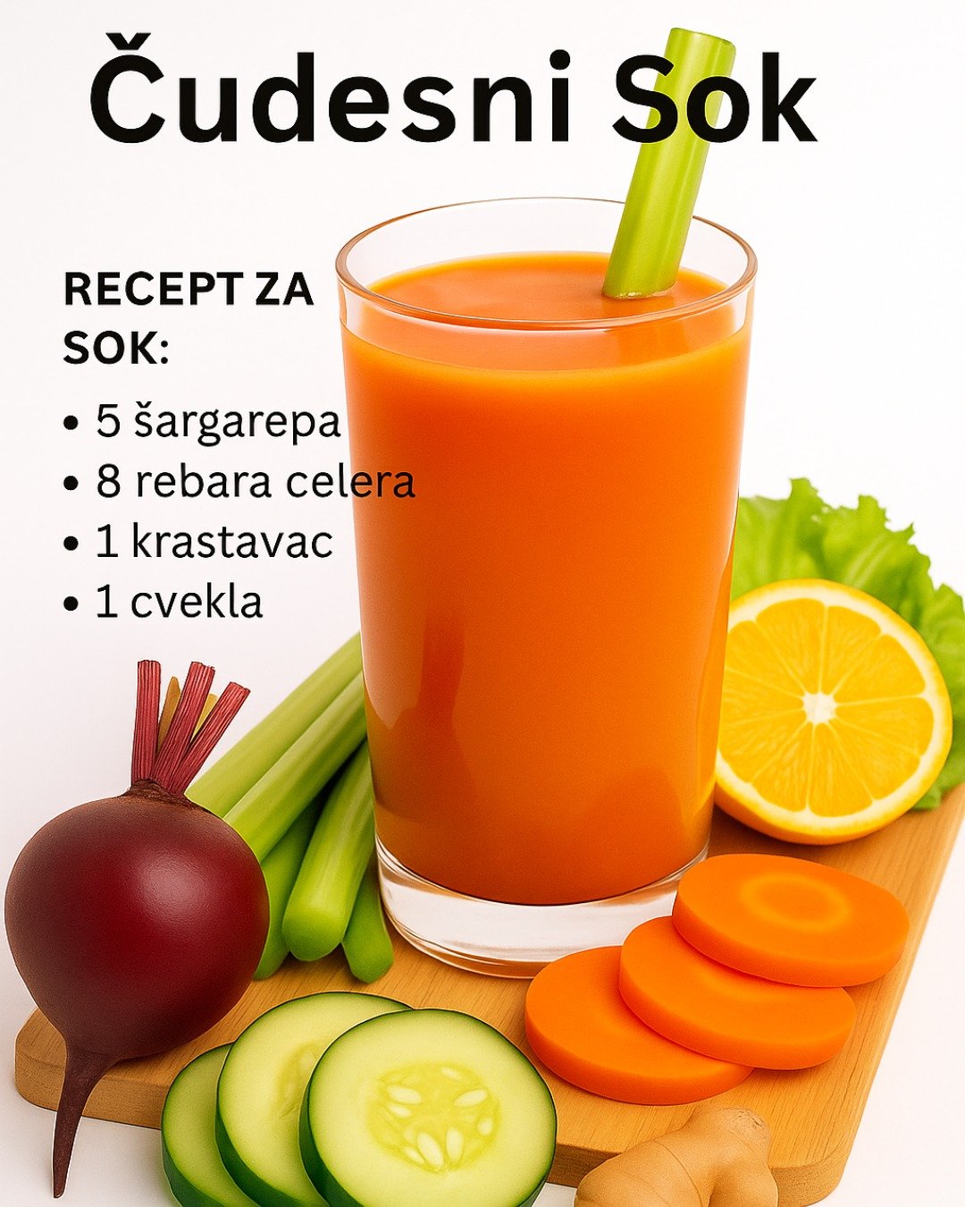 Ovaj čudesni sok, prepun moćnih sastojaka poput šargarepe, celera, cvekle i đumbira, predstavlja pravu bombu prirodne energije i iscjeljujuće snage. Svaki gutljaj donosi vašem tijelu hranjive tvari koje jačaju imunitet, poboljšavaju probavu i podižu nivo energije — sve na potpuno prirodan način.