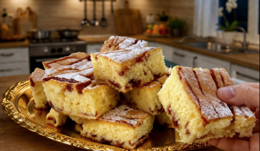 7. Kada se kolač ohladi, pospite ga šećerom u prahu i isijecite na kocke.