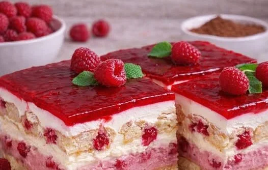 Na kraju pripremite želatin ili preliv: u 200 ml soka od maline ili vode sa šećerom dodajte 1 kesicu želatina (ili preliv za torte) i prelijte preko kolača. Ostavite u frižideru minimum 4 sata da se stegne. Kada se seče, slojevi su savršeno vidljivi, a ukus osvežavajući i kremast – pravi hit desert!