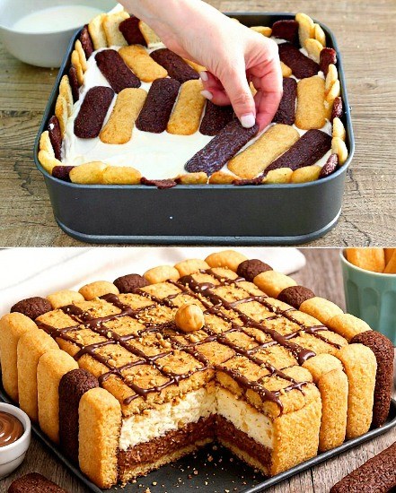 Stranice kalupa obložite naizmjenično: dva klasična piškota, jedan kakao piškot, kako biste dobili vizualno zanimljivu šahovsku šaru. Ovo dodatno naglašava kontrast okusa i boja.