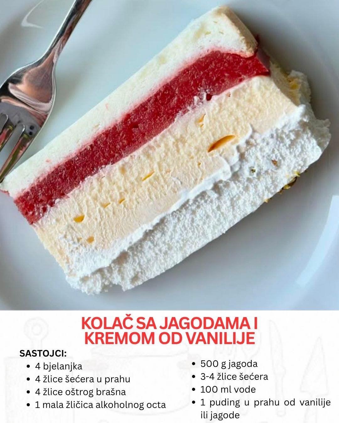 Ako ste ljubitelj laganih, osvežavajućih kolača koji spajaju voćnu svežinu jagoda i bogatstvo vanilin kreme, ovaj recept za kremasti kolač sa jagodama i kremom od vanilije pravo je rešenje za vas.  Kolač koji je napravljen u obliku torte ili u plehu pruža savršenu kombinaciju nežnog biskvita, sočnog jagodnog želea i kremaste, baršunaste kreme od vanilije, koja osvaja svaki put.
