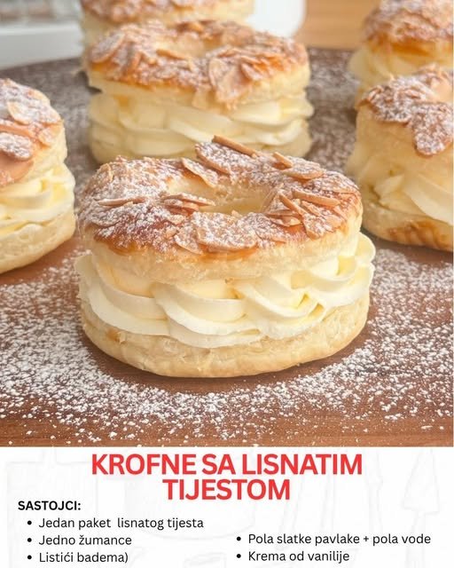U ovom prepričanom receptu otkrićemo kako napraviti krafne koje su vizuelno atraktivnebrze za pripremu, a neodoljivo ukusne, zahvaljujući kombinaciji lisnatog tijestabadema, i kremastog punjenja od vanilije.