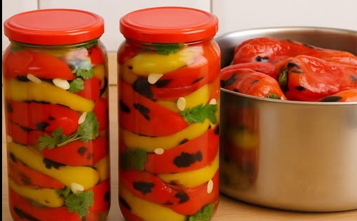 Blanširajte paprike – oljuštene paprike kratko potopite u ključalu marinadu (2–3 minuta).