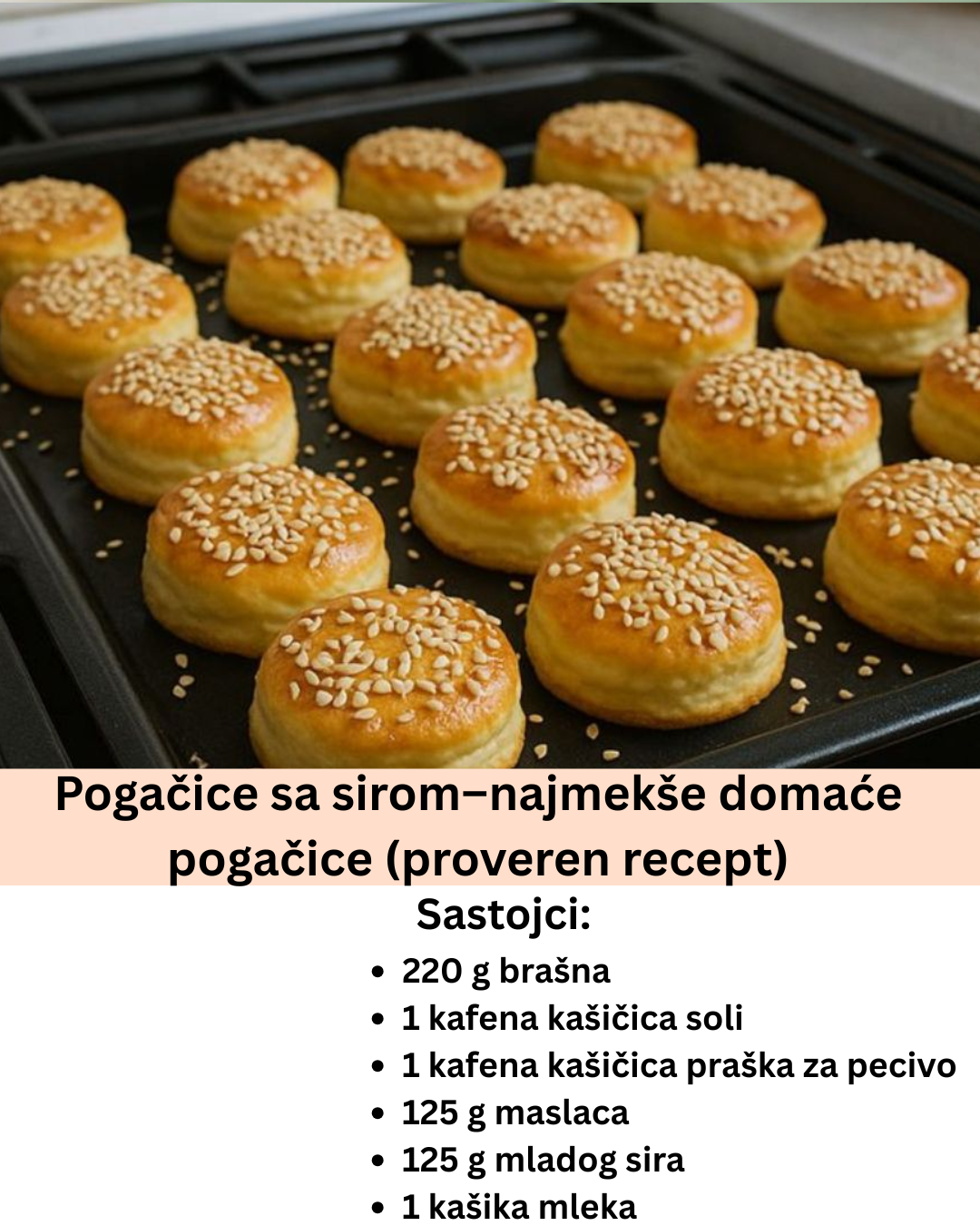 Domaće pogačice sa sirom su klasik koji se pravi brzo, jednostavno i uvek oduševi. Mekane iznutra, blago hrskave spolja, idealne su za doručak, večeru, posluženje uz čašu jogurta, predjelo, ili kao slano posluženje za goste. Ove pogačice su bogate sirom i puterom, prave se bez čekanja da testo raste i gotove su za samo 20 minuta pečenja. Najbolje od svega – potrebni su samo osnovni sastojci i rezultat je uvek savršeno mekano i ukusno testo.