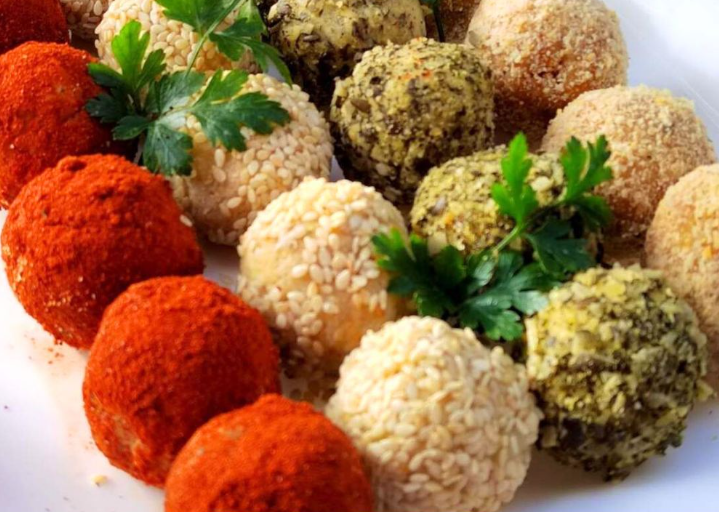 Skuvajte krompir i zatim ga dobro ispasirajte. Dodajte začine po želji, so, biber, peršun, beli luk itd. Kada se smesa ohladi podelite je u četiri činije. U prvu činiju dodajte dve kašike samlevenog kikirikija i dve kašike mlevenog posnog slanog keksa pa oblikujte kuglice i uvaljajte ih u mleveni kikiriki. U drugu činiju dodajte dodajte dve kašike prženog susama i dve kašike mlevenog posnog slanog keksa pa oblikujte kuglice i uvaljajte u susam. U treću činiju dodajte dodajte dve kašike prženih mlevenih golica i dve kašike mlevenog posnog slanog keksa pa oblikujte kuglice i uvaljajte u mlevene golice. U četvrtu činiju dodajte dodajte dve kašike aleve paprike, izrendan sir i dve kašike mlevenog posnog slanog keksa pa oblikujte kuglice i uvaljajte u papriku. Kuglice ostavite preko noći da odstoje na hladnom pa sutradan ukrasite sa listovima peršuna pa ih servirajte.