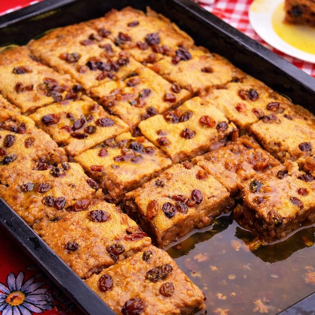 Ostavite dase kolač prohladi oko 15 minuta, isecite kocke i pustite da još upije sirup. Možete još pečen kolač izbockati čačkalicom da bolje upije.