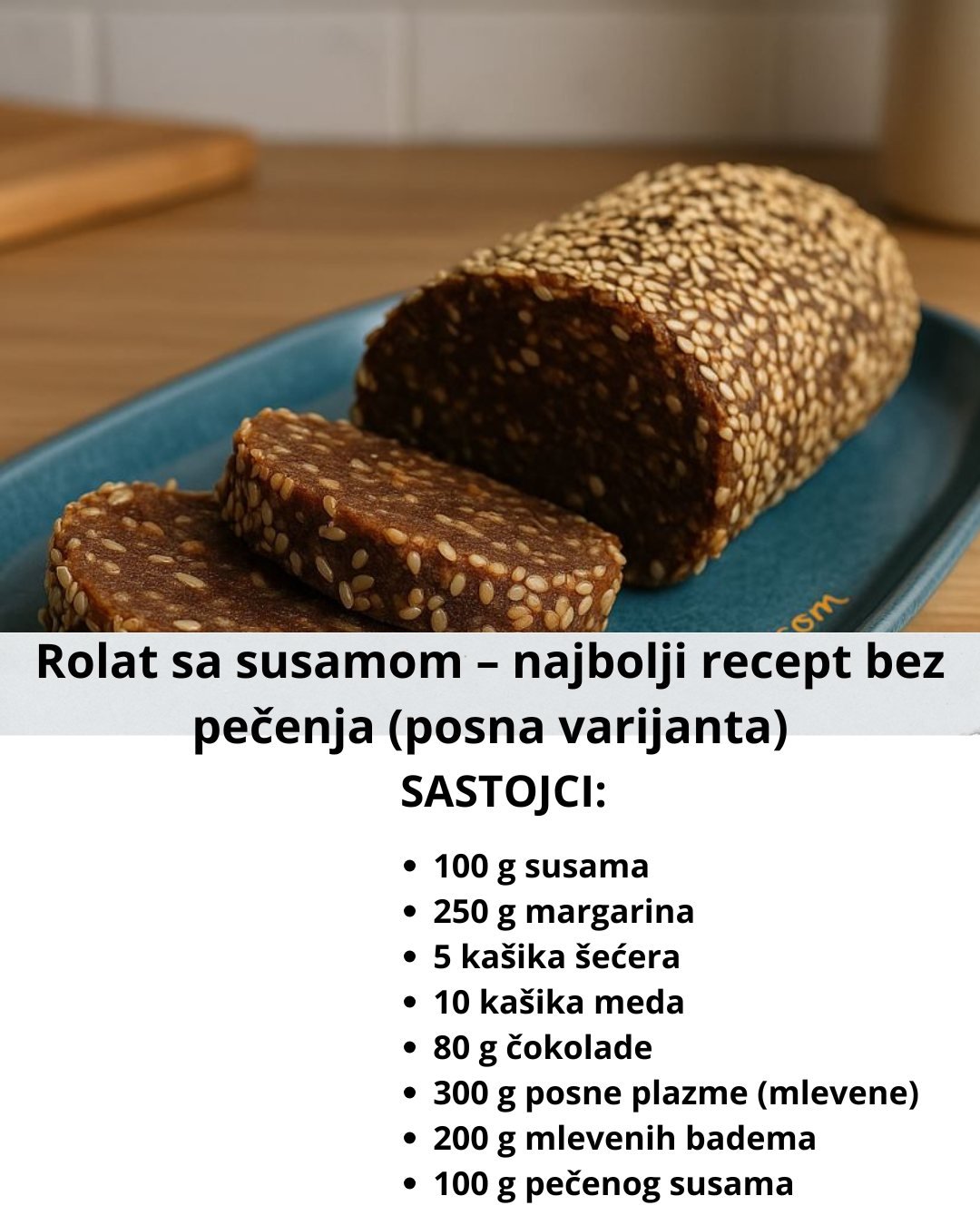 Rolat sa susamom je jedan od najpopularnijih brzih posnih kolača bez rerne. Pravi se za samo nekoliko minuta, savršeno se seče, uvek uspe i idealan je za slavu, praznike, post ili kada želite desert koji izgleda elegantno, a pravi se jednostavno.
