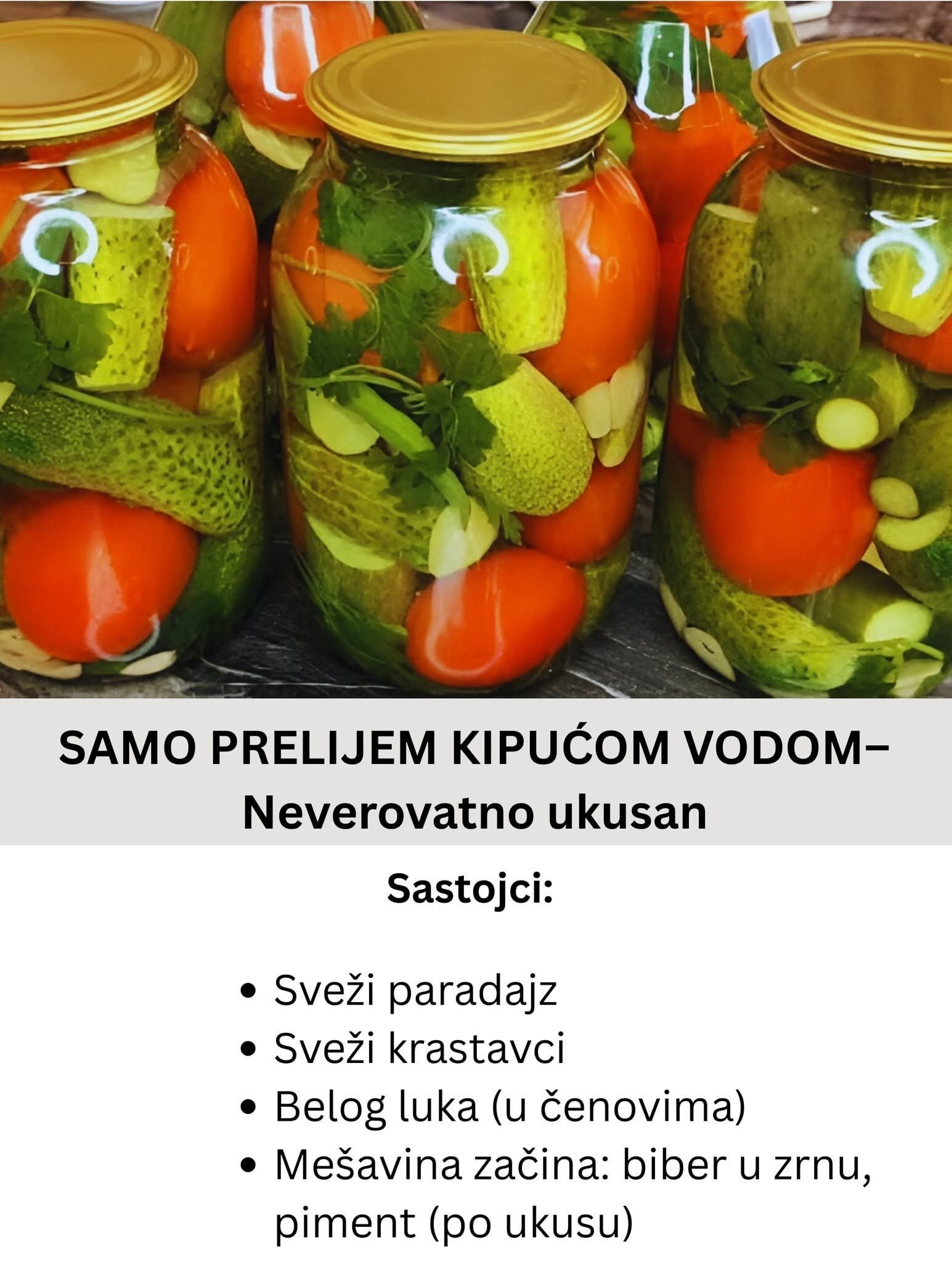 * Slaganje u tegle: Pripremite čiste i sterilisane tegle. Na dno tegle stavite nekoliko zrna bibera, pimenta i par češnjeva belog luka. Zatim, naizmenično slažite paradajz i krastavce. Možete dodati i malo svežeg peršuna ili lista celera za dodatnu aromu.