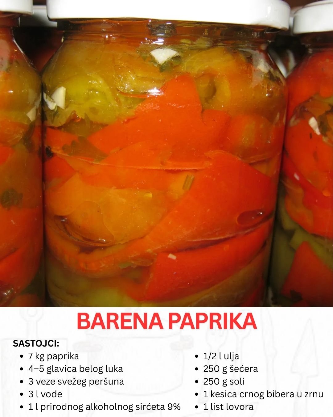Ovaj tradicionalni recept omogućava da tokom cele zime uživate u domaćem ukusu i aromi. Barena paprika se odlično služi kao prilog uz pečeno meso, sendviče ili kao deo zimskih salata. Za najbolje rezultate, paprike čuvajte u hladnom i tamnom prostoru, a tegla nakon otvaranja treba da se drži u frižideru.