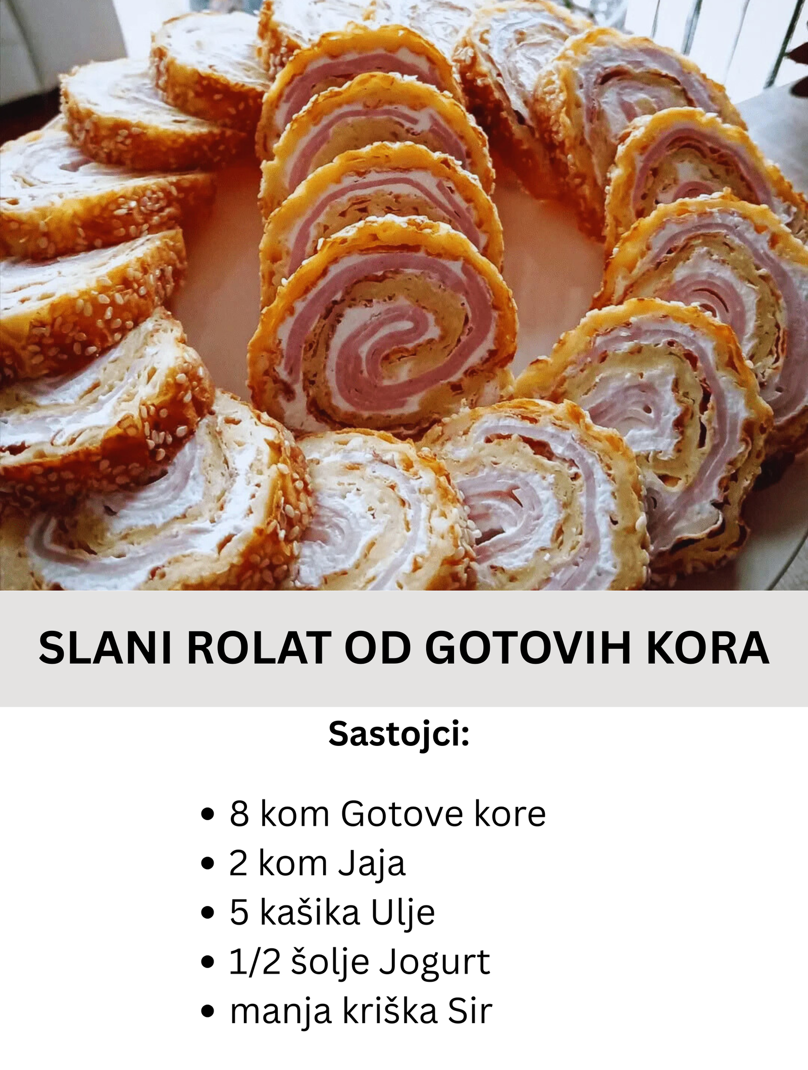SLANI ROLAT OD GOTOVIH KORA September 10, 2025 by Admin Sastojci: 8 kom gotove kore 2 kom jaja 5 kašika ulja 1/2 šolje jogurta manja kriška sira