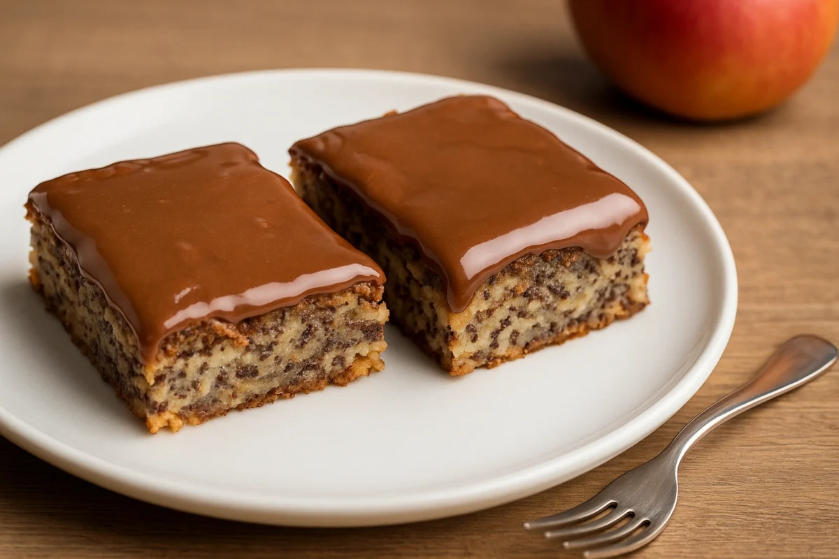 Jednostavan i sočan kolač sa makom i jabukama, preliven džemom od kajsija i čokoladnom glazurom. Jesenji desert koji se odlično slaže uz šolju crne kafe ili tople čokolade.