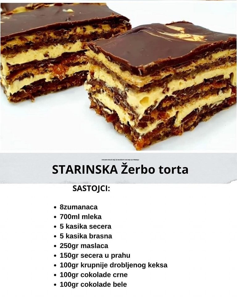 Ako volite bogate, sočne i mirisne kolače koji podsjećaju na djetinjstvo i praznične trpeze, onda je starinska Žerbo torta pravi izbor za vas. Ova raskošna poslastica spaja hrskave orašaste kore, nježnu karamel kremu i čokoladnu glazuru koja se topi u ustima.