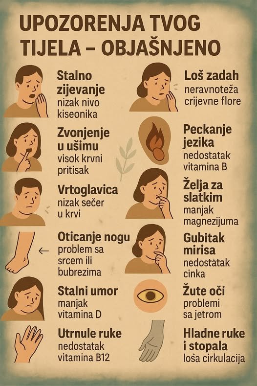 Tijelo uvijek govori — samo ga treba pažljivo slušati. Ovi znakovi ne znače uvijek ozbiljan problem, ali ukazuju da organizmu nešto nedostaje ili da treba dodatnu brigu. Ako se simptomi ponavljaju, najbolje je potražiti savjet ljekara.