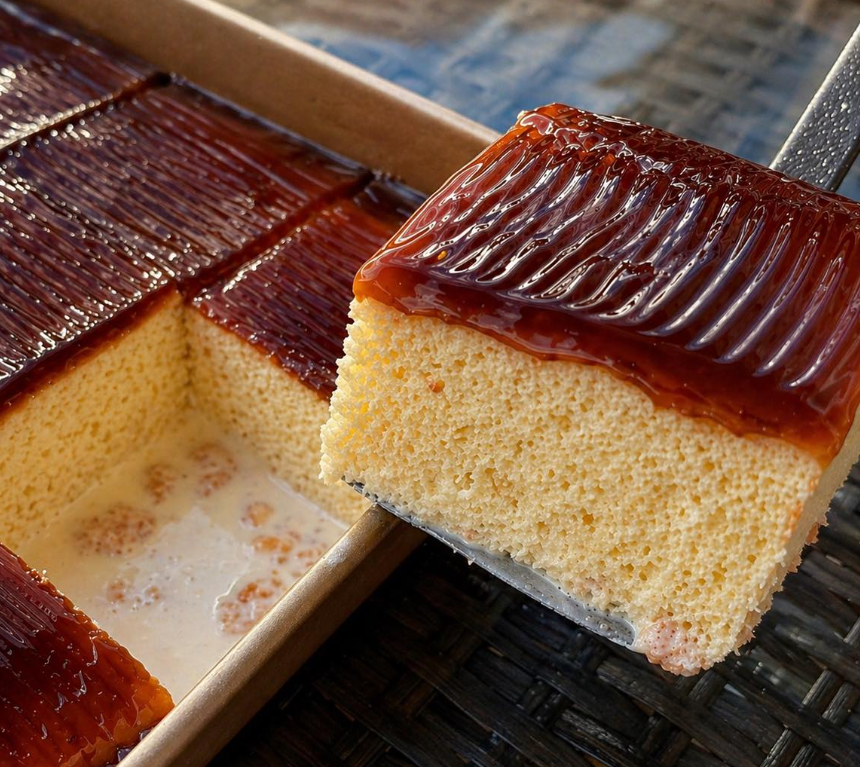 Kada se testo ispeče, ostavite da “odmori” pet minuta i izboskajte ga čačkalicom. Zatim ga prelijte i preko toga premažite karamelom.