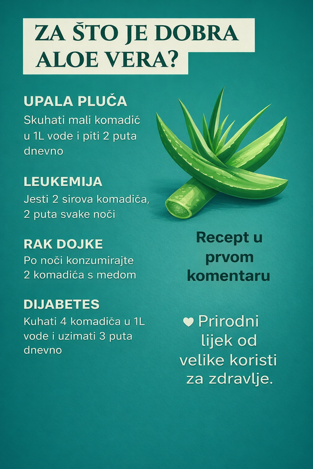 Aloe vera je biljka koja se koristi hiljadama godina u tradicionalnoj medicini, kozmetici i njezi kože. Najpoznatija je po svom gelu, bogatom vodom, vitaminima i bioaktivnim spojevima. Iako aloe vera može biti korisna kao dodatak zdravom načinu života, važno je naglasiti da nije lijek za teške bolesti.